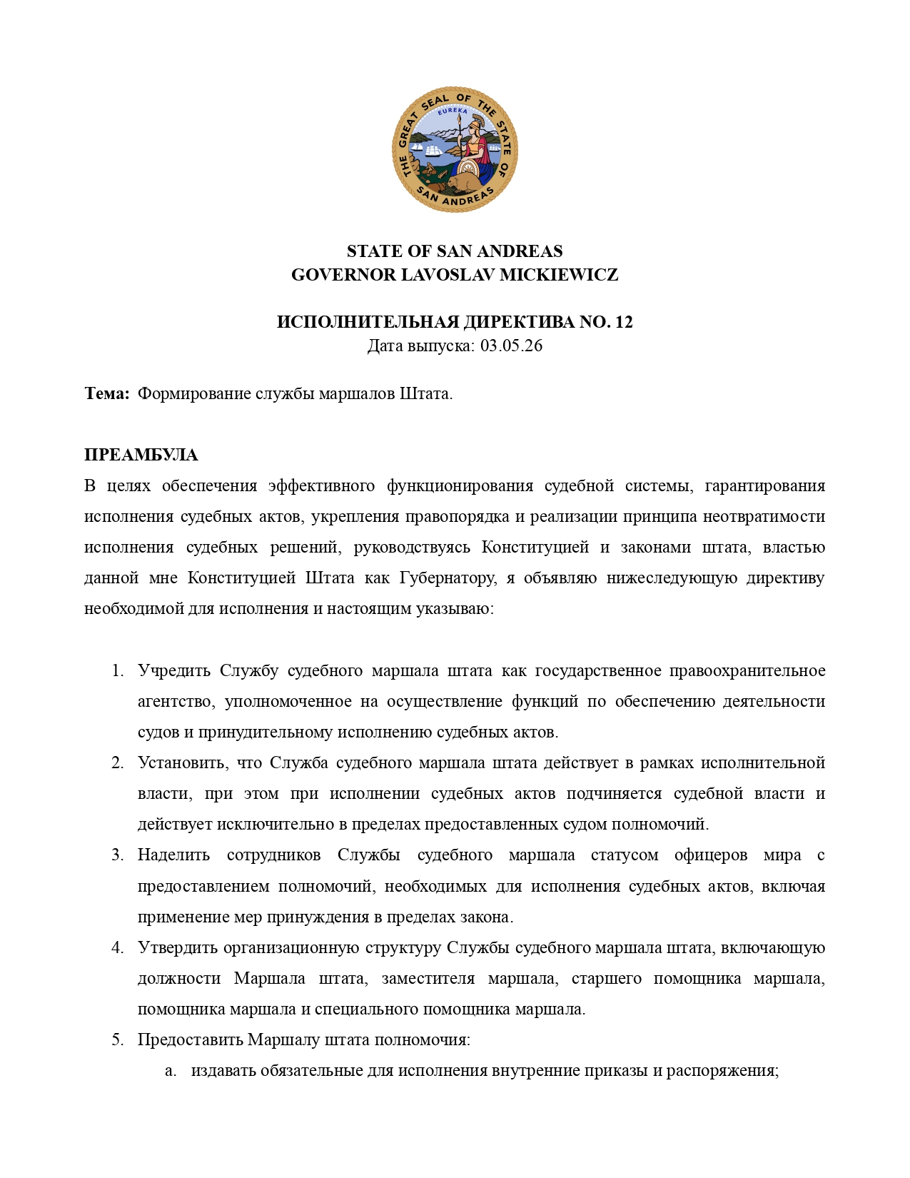 Важно Информация ИСПОЛНИТЕЛЬНАЯ ДИРЕКТИВА NO. 12 ГУБЕРНАТОРА ШТАТА | «О службе маршала»