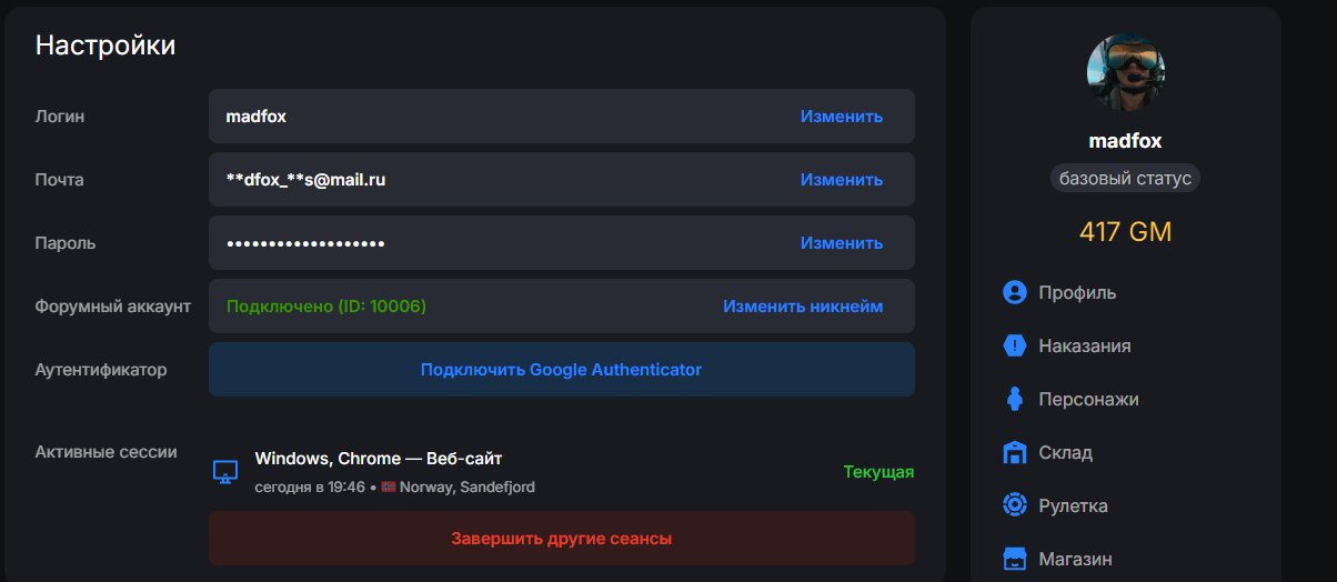 8. Полный скриншот личного кабинета с включённой двухфакторной аунтефикацией: